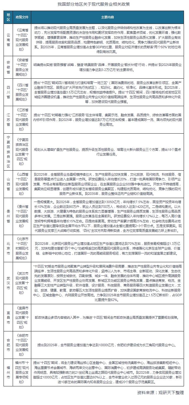 地方層面上,例如云南省發(fā)布的《云南省“十四五”現(xiàn)代服務(wù)業(yè)發(fā)展規(guī)劃》,提出將以推動現(xiàn)代服務(wù)業(yè)高質(zhì)量發(fā)展為主題,以深化服務(wù)業(yè)供給側(cè)結(jié)構(gòu)性改革為主線,以改革創(chuàng)新為根本動力,充分發(fā)揮市場配置資源的決定性作用和更好發(fā)揮政府作用,聚焦重點(diǎn)領(lǐng)域,優(yōu)化發(fā)展環(huán)境,強(qiáng)化數(shù)字賦能,增強(qiáng)要素保障,推動生產(chǎn)性服務(wù)業(yè)融合化發(fā)展,加快生活性服務(wù)業(yè)品質(zhì)化發(fā)展,擴(kuò)大服務(wù)業(yè)有效供給,提高服務(wù)效率和服務(wù)品質(zhì),構(gòu)建特色鮮明、優(yōu)質(zhì)高效、結(jié)構(gòu)優(yōu)化、競爭力強(qiáng)的現(xiàn)代服務(wù)產(chǎn)業(yè)新體系。到2025年,云南省服務(wù)業(yè)增加值占全省GDP的比重、服務(wù)業(yè)對經(jīng)濟(jì)增長的貢獻(xiàn)率“兩個50%”的地位將得到有效鞏固。